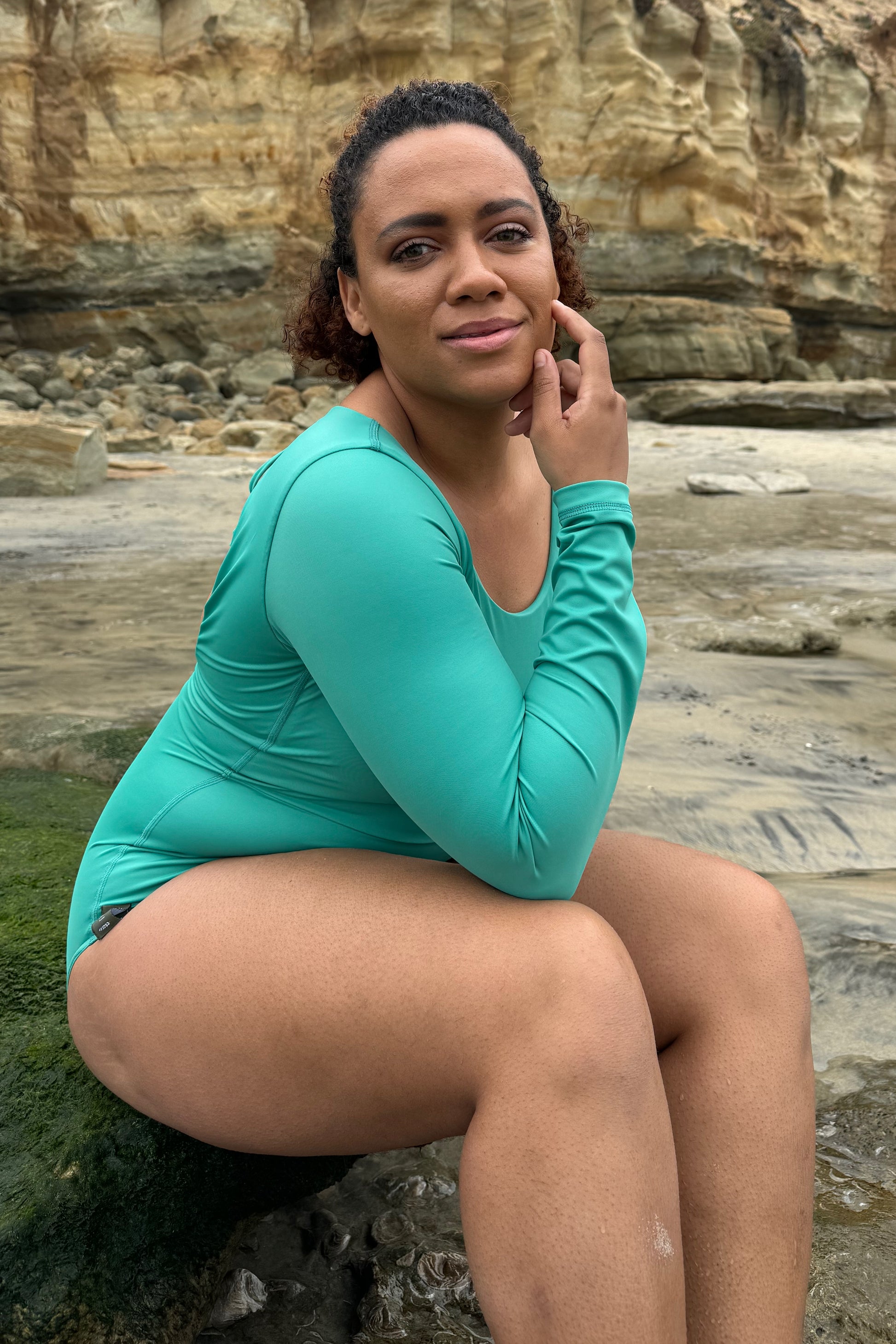 This swimsuit is made in a beautiful turquoise fabric and is completely covering.
