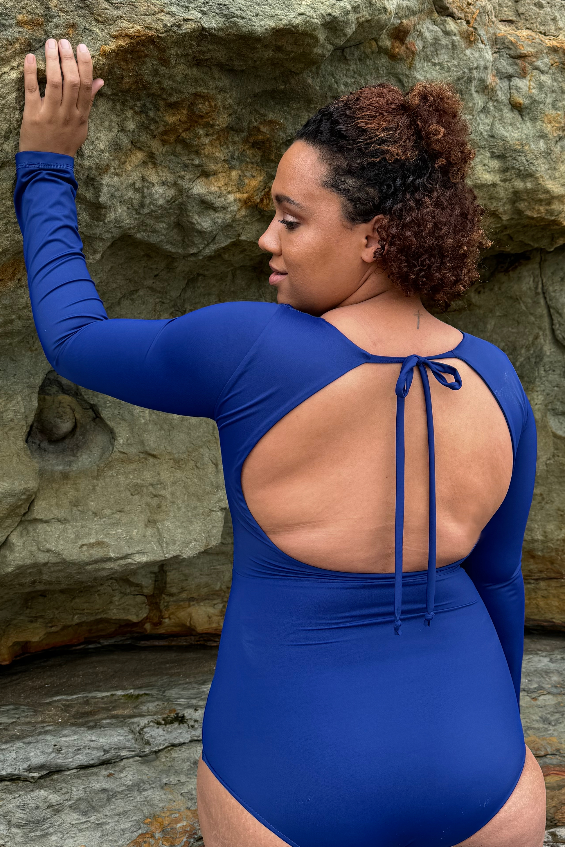 This swimsuit is made in a beautiful blue fabric and is completely covering.