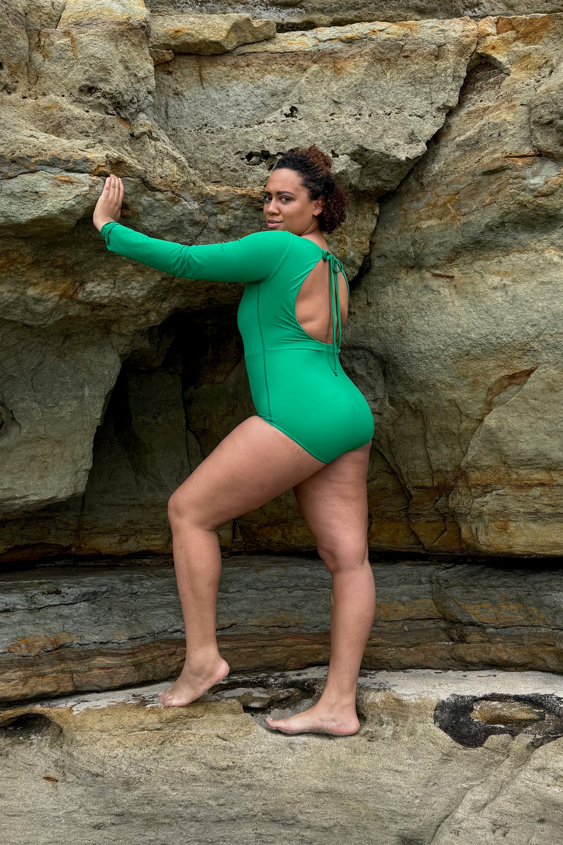 This swimsuit is made in a beautiful green fabric and is completely covering.