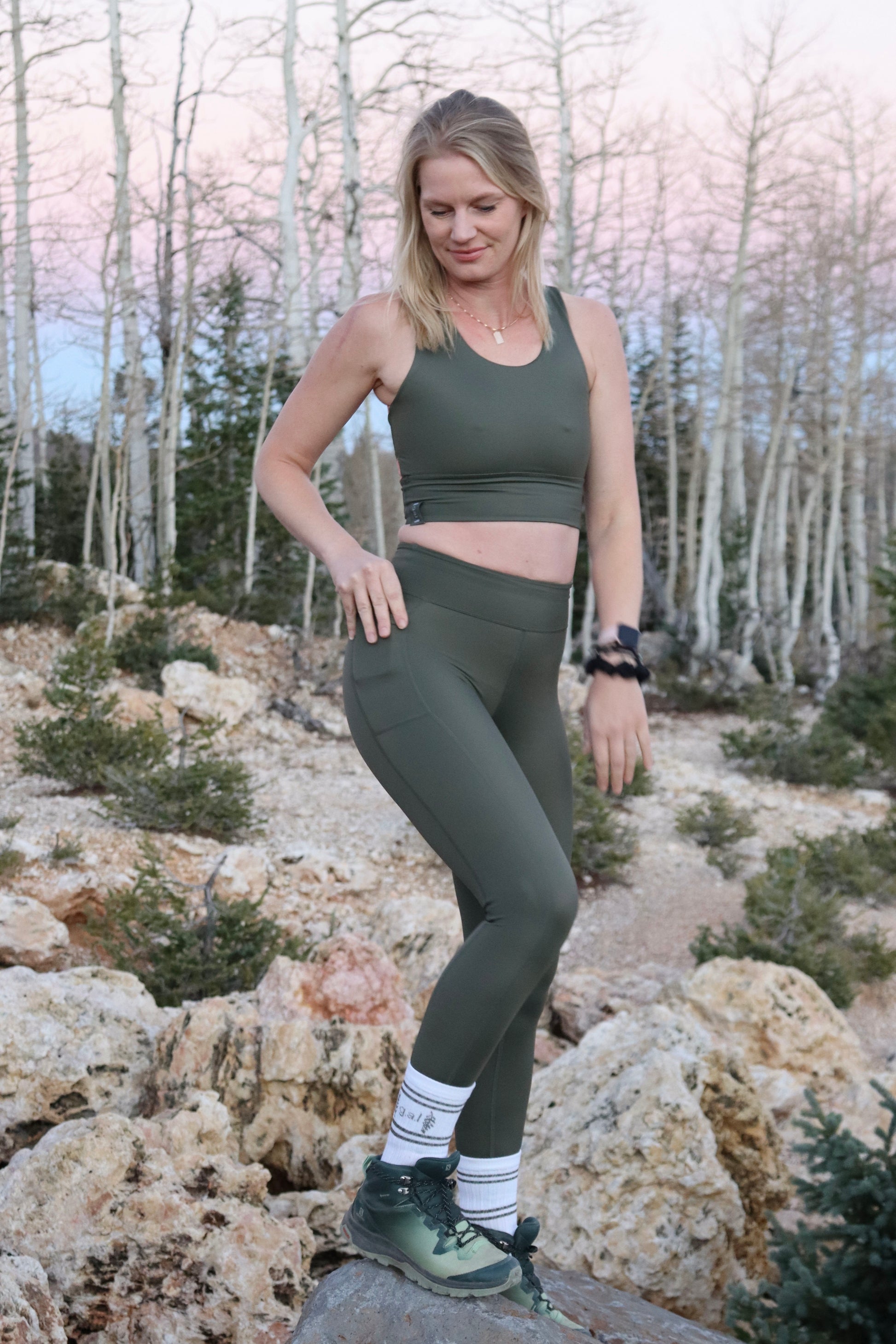 Olive green, high-waisted and with pocket for phone, keys etc.