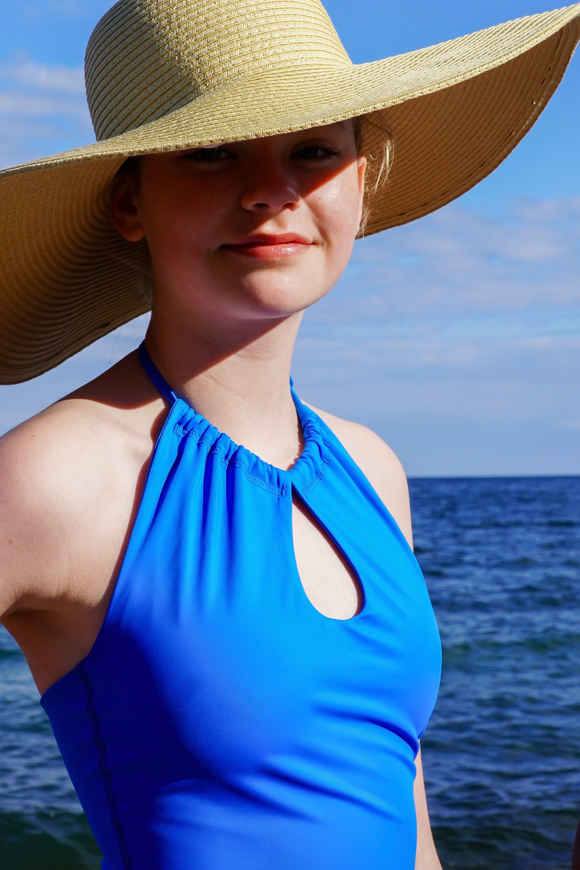Baddräkten är sydd i en vackert azurblått tyg och är knytbar i nacken.