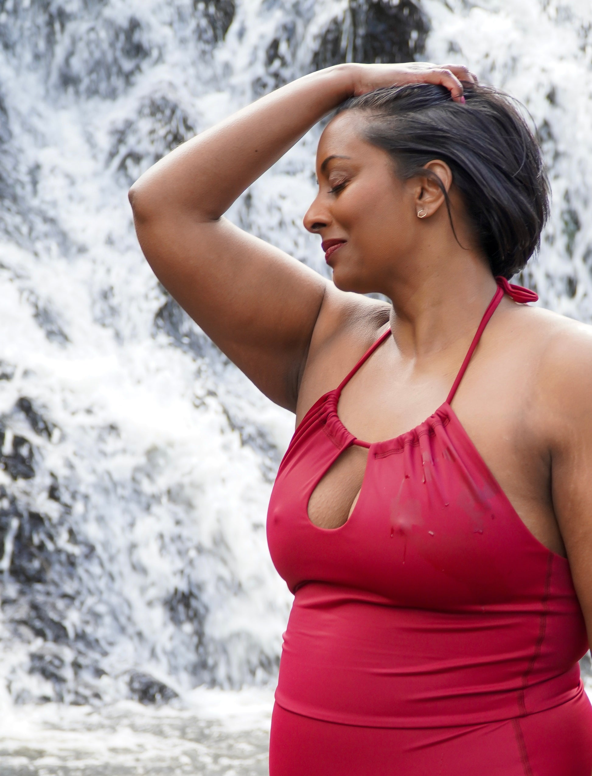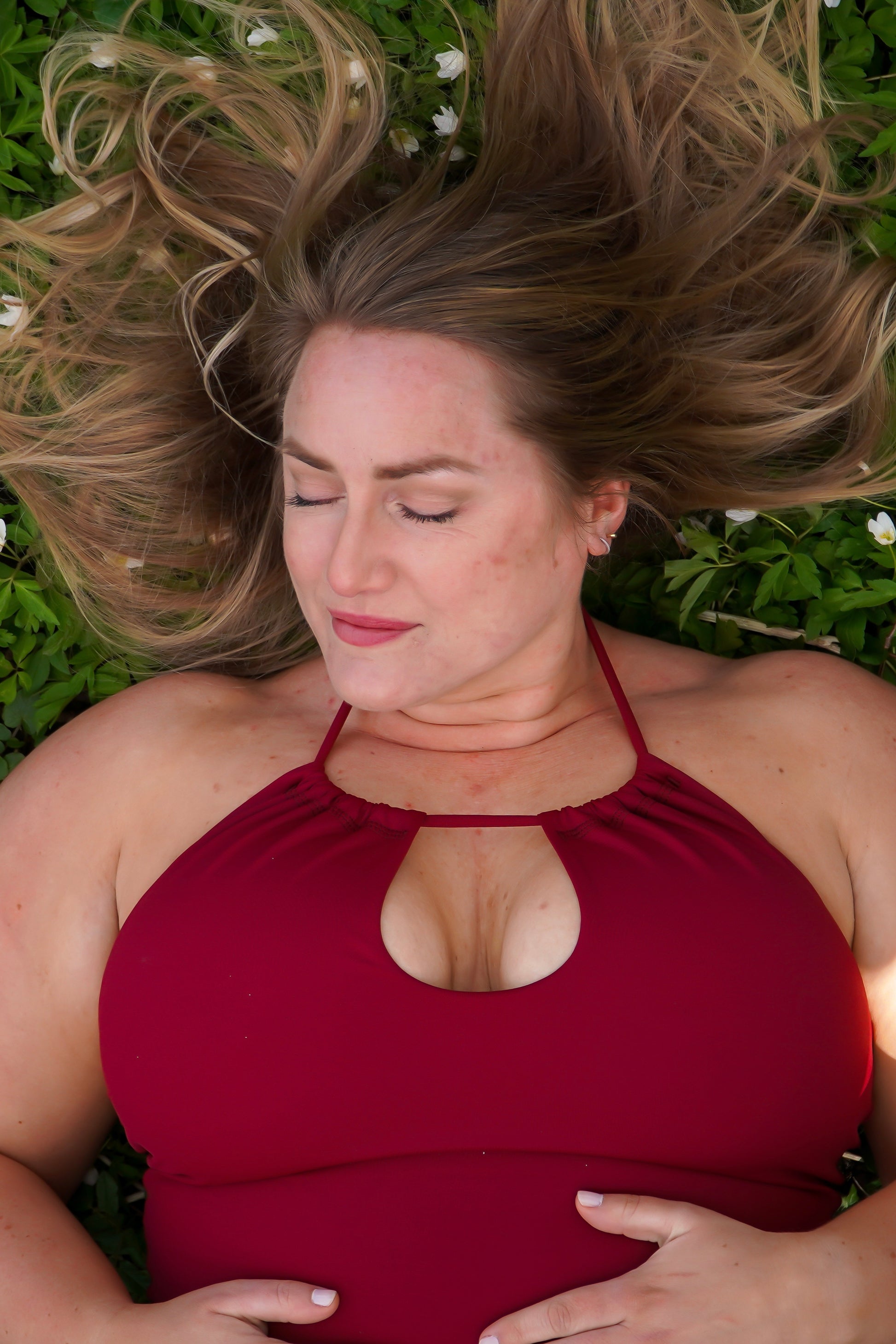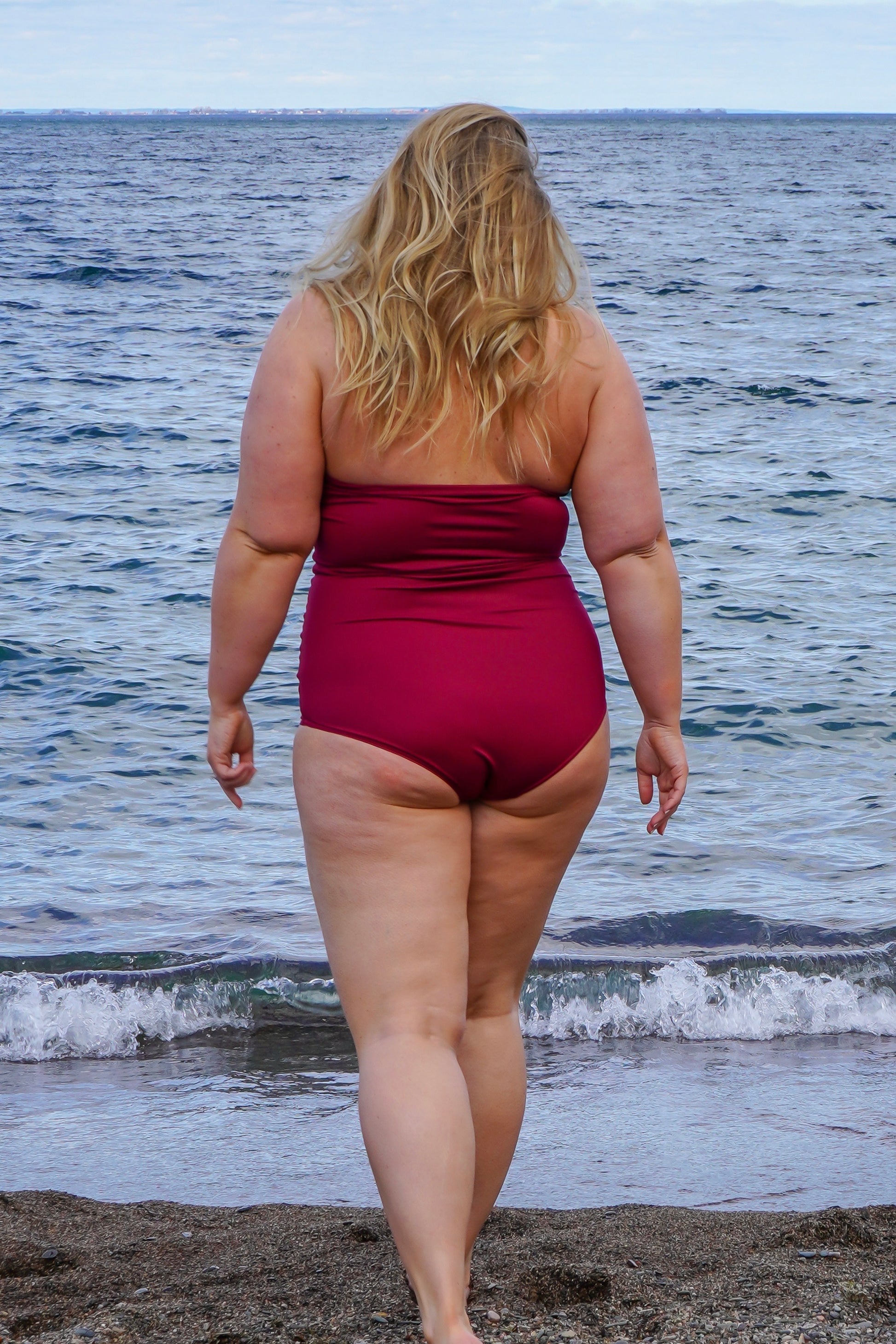 Baddräkten är sydd i en vackert bordeauxfärgat tyg och är knytbar i nacken.