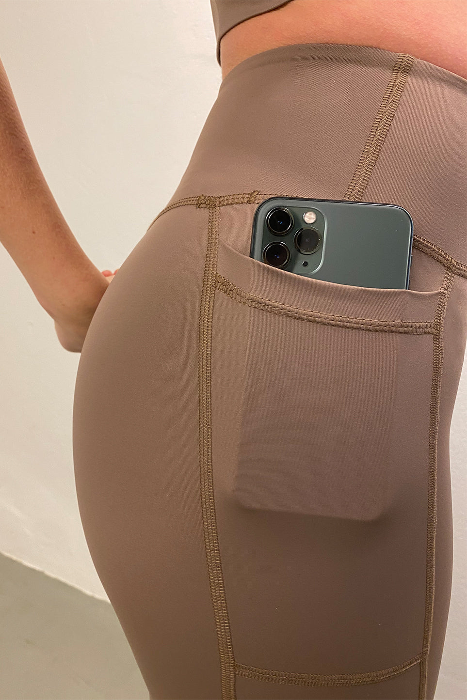 Sand färgade, hög midja och med ficka på höger sida för telefon, nycklar etc. Finns även med dragsko för extra support.